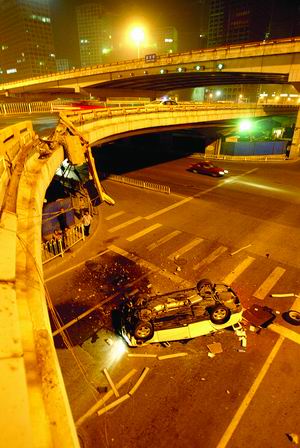 目擊者朱先生說,當時,他開車與這輛奧迪一前一后由京通快速往西行駛,奧迪司機是個長發女子,副駕上坐著個男青年。開到國貿橋上時,他的車跟在奧迪后方50米處。“奧迪的時速大概有70公里,右拐彎的時候,突然偏離了中間的車道。橋上的燈很亮,就看見前面白車一閃。”朱先生說,緊接著一聲巨響,奧迪破欄而出,在空中翻了兩圈后掉了下去。“車里的人肯定傷得不輕”,朱先生趕緊把車盤到橋下。這時奧迪四輪朝天落在橋下的車道上,車頭嚴重扭曲變形,后備廂已經打開,地上散落著很多雜物。副駕上的男青年從車窗鉆出,然后把女司機從車窗拽出來。“他們臉上都有血,萬幸的是看起來沒有大傷。女司機嚇得不輕,一出來就哭,一直哭不說話。”5分鐘后,交警趕到現場,兩人隨即被送往醫院。