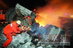 昨晚11時,在八達嶺高速進京方向不斷有救護車和警車來回行進。在昌平區南口鎮山羊洼地段,即在進京方向約49公里處,數十輛救護車、消防車、警車聚集當場,公路護欄被撞斷二三十米,護欄下的溝內,兩車仍在著火。其中一貨車趴在亂石堆上,車頭和車身窩在一起,另一輛客車倒在水里,外殼被燒黑,只可看見里面的座位,記者在現場看到,有一具尸體趴在客車旁的水里。