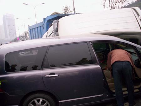 被撞的藍(lán)色POLO轎車的駕駛員廖女士告訴記者,當(dāng)時(shí)她正駕車經(jīng)過南橋頭附近,突然一輛藍(lán)色貨車沖到了前面,只感覺自己的車子連續(xù)被撞了好幾下。廖女士稱,她的車和藍(lán)色貨車撞上了后,下車一看,后面竟然還有十幾輛車撞在了一起。