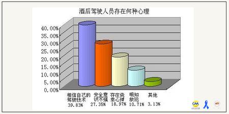 根據來自4538位網友的調查顯示,有81.29%的被調查者同意酒后駕駛屬于違法行為,但在被問及是否有過酒后駕駛行為時,僅有20.63%的被調查者從未有過酒后駕車的行為。在被問及酒后駕駛人員存在何種心理時,有39.84%的被調查者認為酒后駕駛人員過高的相信自己的駕駛技術,27.35%的被調查者認為酒后駕駛人員的安全意識不強。另外,有18.97%的被調查者認為酒后駕駛人員存在僥幸心理。
