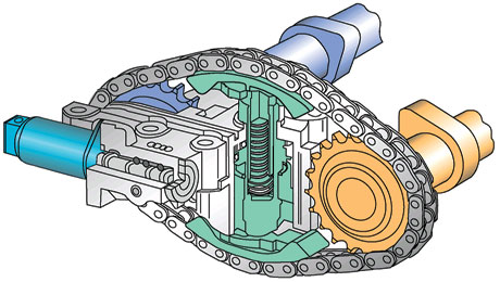 (1)可變配氣正時(shí)機(jī)構(gòu)故障。因?yàn)樵?、3擋加速時(shí)發(fā)動(dòng)機(jī)已經(jīng)進(jìn)入了中等負(fù)荷工況,根據(jù)這款發(fā)動(dòng)機(jī)的特點(diǎn),配氣正時(shí)應(yīng)該已經(jīng)進(jìn)入了調(diào)節(jié)位置,調(diào)節(jié)方式是通過(guò)改變鏈條張緊輪的位置來(lái)實(shí)現(xiàn)的(圖1)。根據(jù)原理可知當(dāng)凸輪軸鏈條進(jìn)行調(diào)節(jié)時(shí),如果鏈條張緊器力量不足就會(huì)使鏈條在調(diào)節(jié)過(guò)程中處于松弛狀態(tài)而發(fā)出響聲。