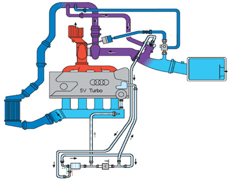 使用專用故障診斷儀V.A.G1552調(diào)取發(fā)動(dòng)機(jī)故障碼,沒(méi)有故障碼顯示。讀取數(shù)據(jù)流并讓車主按照能夠發(fā)出異響的狀態(tài)駕駛,重點(diǎn)讀取增壓壓力值,在V.A.G1552上逐次鍵入01-08-115,其中第3區(qū)為理論增壓壓力,第4區(qū)為通過(guò)中冷器處的壓力傳感器測(cè)量到的實(shí)際增壓壓力。當(dāng)車主駕駛車輛在3擋以40 km/h緩慢加速時(shí),從V.A.G1552上看到第3區(qū)的理論增壓壓力為101 kPa,而第4區(qū)實(shí)際的增壓壓力值已經(jīng)達(dá)到了127 kPa,此時(shí)開始聽(tīng)到了發(fā)動(dòng)機(jī)傳出“咯啦、咯啦”的聲音,看來(lái)問(wèn)題的原因是實(shí)際增壓壓力過(guò)大導(dǎo)致發(fā)動(dòng)機(jī)出現(xiàn)爆燃的,而增壓壓力過(guò)大的原因則有可能是空氣再循環(huán)閥沒(méi)有開啟。