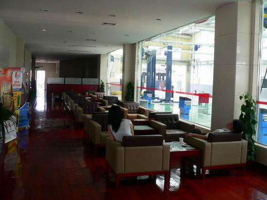 在長凱店的客戶休息區(qū),他們的展廳和維修區(qū)采用的是通光玻璃,客戶可以最直觀的看到自己愛車實時維修情況,同時銷售店的人員會馬上為您送上一杯純凈水,讓你耐心等待。如果客戶想具體了解自己的車輛目前正在進行哪一個環(huán)節(jié)的維護,只需要向前走幾步,來到另外一個區(qū)域,通過一個等離子電視連接CS系統(tǒng),等離子電視的一半屏幕現(xiàn)實所有在修客戶車輛的實時進行情況,而另一半屏幕繼續(xù)放一些電視或者DVD娛樂節(jié)目,可謂兩不誤。這在國內(nèi)的4S店還是較為少見,體現(xiàn)了廣豐店先進的科技和人性化服務(wù)一面。