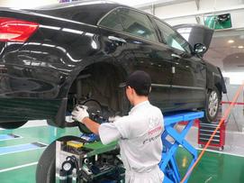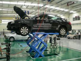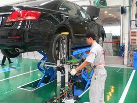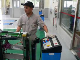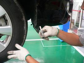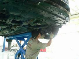 在確認(rèn)沒(méi)有任何問(wèn)題之后,維修人員首先在維修單上做記錄,然后準(zhǔn)備下一步的工作。和副維修人員確認(rèn)過(guò)后,由主維修人員使用升降機(jī)將車(chē)輛提升到剛好超過(guò)頭頂?shù)奈恢茫瑢?duì)車(chē)輛的地盤(pán)進(jìn)行檢查(主維修人員檢查前半部分,副維修人員檢查后半部分)。底盤(pán)的檢測(cè)項(xiàng)目也非常的仔細(xì),檢查輪胎的胎面,測(cè)量胎紋深度(一般為8mm),將輪胎里面的小石子清理出來(lái),檢查排氣管、制動(dòng)管路等等,看看沒(méi)有松動(dòng)或者脫離的地方。