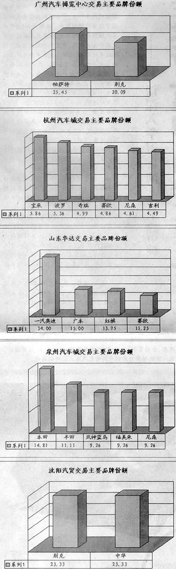 各地汽車暢銷品牌穩(wěn)定程度不一。一些城市,如北京和沈陽、廣州,本周的主要品牌排位基本穩(wěn)定。廣州頭兩位依舊是帕薩特和別克,沈陽是中華和別克,北京是夏利和捷達(dá);而其它有些城市的主要品牌排位卻發(fā)生了較大的變動(dòng):杭州的第一、二位是寶來和波羅并且銷售占有率較上期明顯提高,本田在泉州一躍而成為品牌排名第一,并達(dá)到了14.81%的銷售占有率。這說明了各地消費(fèi)者的偏好和品牌忠誠度不盡一致。及時(shí)發(fā)現(xiàn)并掌握各地消費(fèi)者的特點(diǎn)也是各廠家首要考慮的問題之一。