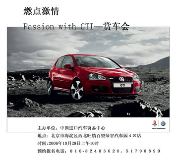 中國進口汽車貿易中心大眾4S店誠邀各位對大眾GTI感興趣的朋友,出席我們盛意為您準備的“燃 點 激 情——Passion with GTI”的饕餮大餐。