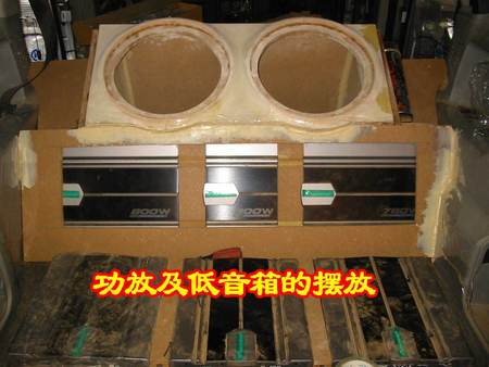 圖解7、在功放上面,改裝師還為兩個大尺寸低音單元準(zhǔn)備了專門打造的支架