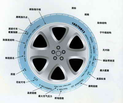 如圖所示。 1. 輪胎胎面:1個(gè)厚厚的橡膠層,提供了與地面的接觸界面,還具有排水和耐舊的性能。 2. 胎冠帶束層:雙層或3層加強(qiáng)帶束層具有垂直方向上的柔韌度和極高的橫向剛性,提供了轉(zhuǎn)向力。 3. 胎側(cè):胎側(cè)容納并保護(hù)胎體簾布層,而胎體簾布層的功能是將輪胎的胎面固定在輪輞上。 4. 用于固定在輪輞的胎唇部分:它內(nèi)部的胎唇鋼絲圈可以使輪胎牢牢地固定在輪輞上,使之結(jié)合在一起。 5. 氣密層:它保證了輪胎具有良好的氣密性,并保持正確的胎壓。 規(guī)格及其標(biāo)識(shí) 有些車(chē)主對(duì)于自己愛(ài)車(chē)輪胎上的標(biāo)識(shí)意義還不是很清楚,下面就對(duì)胎側(cè)面的標(biāo)識(shí)進(jìn)行解釋。例如: 某輪胎標(biāo)識(shí)為“P 225/65 R 16 89 H ”,其中: “P” 是指轎車(chē)輪胎(用以區(qū)別卡車(chē)或其他車(chē)型適用的輪胎) 。 “225”指的是輪胎斷面的寬度,是兩個(gè)胎側(cè)之間的寬度(以毫米為單位)。此寬度隨輪胎所匹配輪輞寬度的不同而不同:寬輪輞配寬輪胎,窄輪輞配窄輪胎。一般在胎側(cè)上所標(biāo)示的胎寬,是指當(dāng)輪胎安裝到所建議寬度的輪輞時(shí)的寬度。 “65”是輪胎的扁平比,是胎寬與胎高的比例,這里指胎高占胎寬的65%,數(shù)值越小,越顯扁平。 “R”是指輪胎的結(jié)構(gòu),表示此輪胎為子午線結(jié)構(gòu),也就是說(shuō)它的簾布層是呈輻射狀排布在胎體內(nèi)的。“B”表示輪胎為斜交結(jié)構(gòu),目前斜交結(jié)構(gòu)的轎車(chē)輪胎已不復(fù)存在。 “16”表示輪輞直徑(以英寸為單位),此輪胎必須匹配16英寸的輪輞,否則無(wú)法安裝。 “89”表示載重指數(shù):此輪胎最高載重為580 kg。不同的載重指數(shù)代表不同的最高載重。 “H”表示速度級(jí)別:此輪胎最高時(shí)速為210 km/h。不同的英文字母表示不同的速度級(jí)別。下表列出每一速度級(jí)別所對(duì)應(yīng)的最高時(shí)速,此表適用于所有品牌的輪胎: 速度代號(hào)最高時(shí)速(km/h) M130 N140 P150 Q160 R170 S180 | T190 U200 H210 V240 W270 Y300