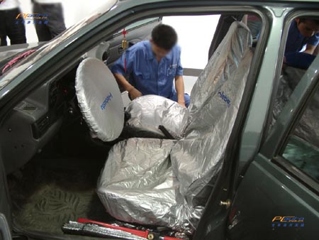 工作人員檢查車況  把座椅套上,防止污損  外車頂定位紙裝貼在外部車頂