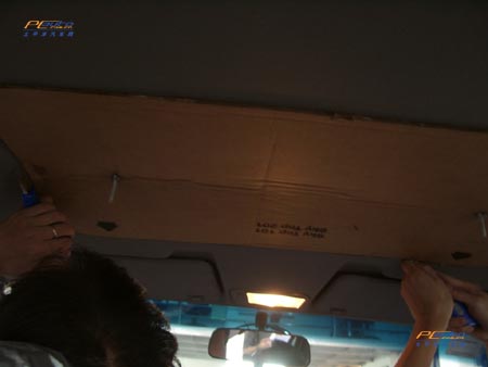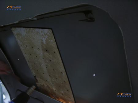 上下定位紙貼好后,毫無怠慢地立刻投入內飾板的切割。內飾板很薄容易切割,因為其只是一層纖維板和嵌鑲的一塊橡膠皮制成。此后,車頂鋼板內部的減震皮即映入眼簾——這是一層橡膠皮,牢牢粘貼在車頂中線位置。不過卻費了工作人員較多時間來刮除切割位置的橡膠皮。
