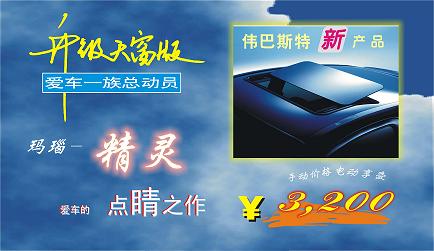 目前還有很多國產(chǎn)車尚未配置原裝天窗,后加裝天窗成為一種時(shí)尚。偉巴斯特推出了一款“瑪瑙-精靈”電動(dòng)天窗。這種新款天窗具有卓越的性能和精靈小巧的外型,以及體貼入微的設(shè)計(jì),唯一不同的是更貼近用戶的價(jià)格——被稱為一款大眾化卻又不失時(shí)尚體面的產(chǎn)品。