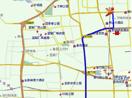 幾分鐘后,GPS連接正常,車輛定位成功。首先設定知春里為始發地,永定路1號院為目的地,然后開始導航。開始出發時,箭頭的移動速度隨著車速變快。