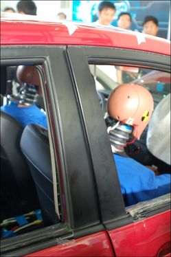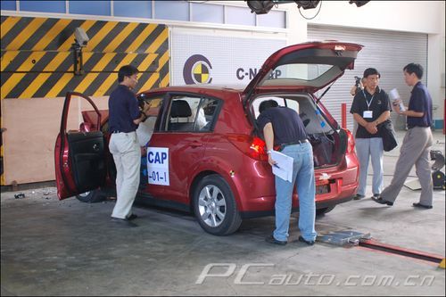 試驗過程中,總共使用三個假人。位于前排正副駕駛位置的為兩個男性假人(Hybird III型50%,重量約75公斤),后排則獨具中國特色的安放有一個女性假人(Hybird III型5%)。分別用來測量受傷害情況和后排安全帶工作情況。現場隨著工作人員“3、2、1”的倒數,首天的試驗開始了,由地上索道的試驗車輛(牽引加速度小于等于0.3g,以保證假人在碰撞發生時的姿態)在經過前半程的加速后,開始勻速駛向剛性壁障。“砰”的一聲巨響之后,車輛向后退出1米左右的距離,至此試驗宣告結束 試驗后得出的結論分為兩大部分,即定量分析結論和定性的結論。前者自不必說,就是試驗后的數據分析,而后者則是通過幾項檢查簡單的概括車輛此時狀態是否正常,及是否達到基本的安全標準。