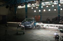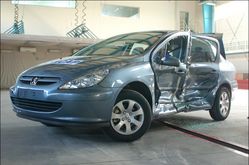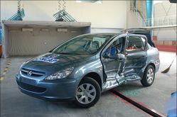 在試驗過程中,記者注意到,相比以前的試驗,307并沒有被撞出很遠。雖然沒有實地測量,但這個距離確實要比騏達短一些。這應該與307相對較大的自重有著直接關(guān)系。由于撞擊點集中在車門的中柱周圍,因此車門的邊緣向外翻起。尤其是后門,已經(jīng)張開了一個很大的口。但我們可以從照片中清楚地看到,門鎖依然緊緊地扣著,沒有在撞擊中被打開,還是可以確保后排成員安全的。307的車門在撞擊后發(fā)生了比較大的凹陷,從外面基本上看不出側(cè)面防撞梁的影子,估計由于沖擊力較大已按設計發(fā)生彎曲變形。除此以外,中柱、底板側(cè)梁、和頂部側(cè)梁的剛性值得稱道,變形幅度均很小。