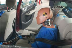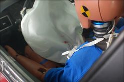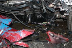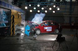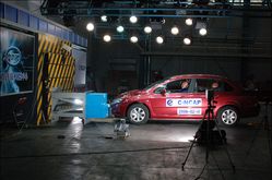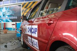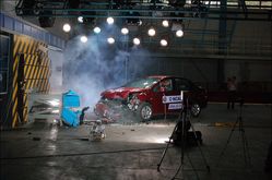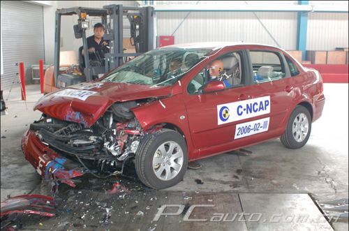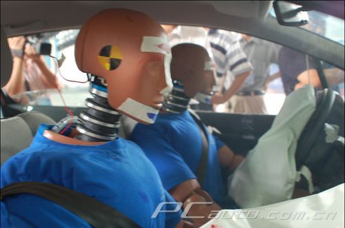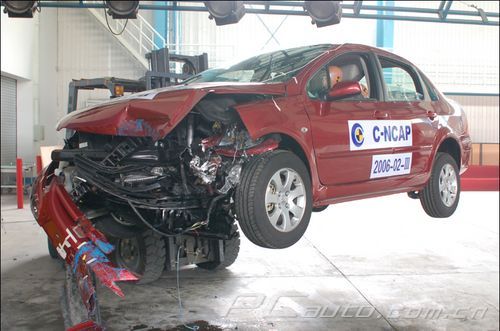 這項試驗中,車速比以前兩項試驗要高一些,達到55-56km/h。不過這個速度要低于歐洲Euro NCAP的64km/h。這主要是考慮到我國汽車工業(yè)整體水平而制定的。車重達到1.3余噸的標致307在這樣速度下撞向可變型蜂窩鋁,而后向右后方反彈了將近2米的距離。在碰撞中,307的車頭,尤其是與蜂窩鋁接觸的左半部嚴重變形。保險杠在撞擊中脫落,左側(cè)翼子板沒有發(fā)生褶皺而是直接斷裂(這一點很屬于正常情況,因為像發(fā)動機蓋、翼子板對吸能基本上沒有什么幫助)。由于車頭變形非常嚴重,劇烈的撞擊已經(jīng)影響到了左前方的車輪。在撞擊的連鎖反應(yīng)下,該車輪已經(jīng)向后移位并頂?shù)搅撕竺娴能圀w。不過并沒有對駕駛員的腿部和腳步空間構(gòu)成什么影響。引用現(xiàn)場工作人員的話說,“車頭變形很嚴重,甚至有些過于嚴重,但整體吸能效果非常好。”這樣做的目的無外乎就是將撞擊的能量盡量減少到不會威脅到乘員空間的程度。