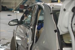 現(xiàn)場(chǎng)可以看到,在受到撞擊后,雅紳特的側(cè)面前后車門已經(jīng)嚴(yán)重凹陷。而后門的上部則脫離開了車體框架,張開一個(gè)大口(騏達(dá)和307基本如此),但四個(gè)車門依舊牢牢的鎖住沒有被打開。底梁和中柱出現(xiàn)變形,頂梁則有輕微的凹陷,但幅度都不大,基本上抵御住了來自側(cè)面的沖擊。打開另一側(cè)車門觀察內(nèi)部,也未有什么異常,假人坐姿非常端正,并沒有倒向一邊。 |