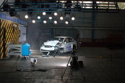 第三天的試驗仍舊是正面40%重疊可變性壁障碰撞試驗,也是對雅紳特的最后一關考驗。根據C-NCAP操作規程中的要求,在此項試驗中車輛將以55km/h~56km/h的速度撞向固定可變形吸能壁障(蜂窩狀鋁合金可變形壁障,俗稱蜂窩鋁)。相比Euro-NCAP的64km/h的撞擊速度,目前C-NCAP試驗的強度明顯要低一些。 國內偏置碰撞試驗的速度是很多消費者相對質疑比較多的問題,正如我們在以前的文章中提到的,國內C-NCAP制定這樣的碰撞速度是充分考慮目前我們的車輛安全水平和國內用車環境的,而并非試驗的速度越快越好。歐盟于1995年頒布的正面碰撞試驗法規ECE R94中規定,碰撞形態為50km/h帶ASD的30度斜角碰撞。而在1998年經過對ECE R94的修改,提高到了56km/h的ODB垂直碰撞。直到目前歐洲NCAP試驗對碰撞速度的要求達到了64km/h,同樣是循序漸進的。