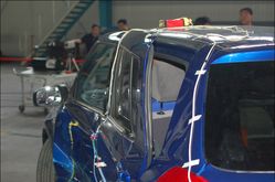 來看一下現場情況,碰撞試驗結束后,可變形壁障周邊涂抹的黃色涂料在雨燕的車身上留下了清晰的撞擊印跡(成長方形)。雨燕的右側兩車門向內凹陷,斜置在車門內的兩根防撞鋼梁已被清晰地“印”了出來。車窗的外框向外翻起形成開口(相對而言后面的開口更大一些)。車架底梁的外皮出現一些內凹,但與B柱一樣,變形都相對較有節制,基本抵御住了來自側面變形壁障的沖擊。再看車內,試驗后假人仍舊保持著良好的坐姿,說明在撞擊過程中,保險帶發揮了有效的約束作用。  撞擊后假人坐姿端正