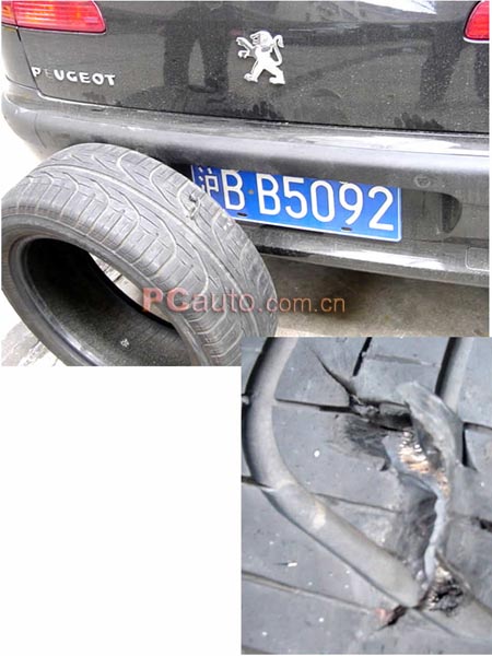 2003年3月6日,里程約18000公里時(shí),我和胡興文先生以及其他兩位客人從上海到溫州,下了高速路等人時(shí),一位客人驚奇的發(fā)現(xiàn)右前胎凸起一個(gè)包,形似輪胎中簾子線斷裂所致,恐有爆胎危險(xiǎn),回上海后,由亞聯(lián)廠檢修后更換,并拍了照片,向標(biāo)致公司反映情況及要求索賠。