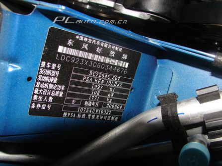 標(biāo)致新307 2.0L車(chē)型銘牌(可以清晰地看到功率為108KW)
