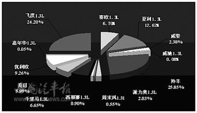 圖為2004年1.3L各品牌轎車市場占有率一覽