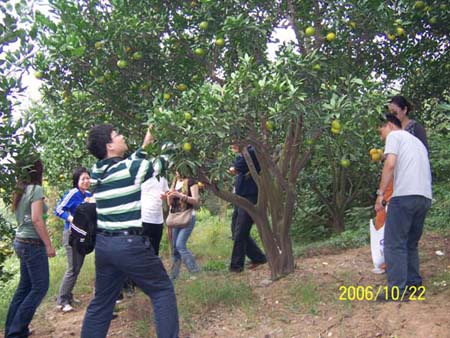 20分鐘之后,4艘快艇在愉悅的笑聲中抵達三山島,據說還是《橘子紅了》的拍攝地點。這個季節正值橘子上市,"滿山皆是黃金甲",大家自然不愿放過這個大好的機會,猶如猛虎下山,更有身手敏捷的已經邊摘邊吃地忙開了。