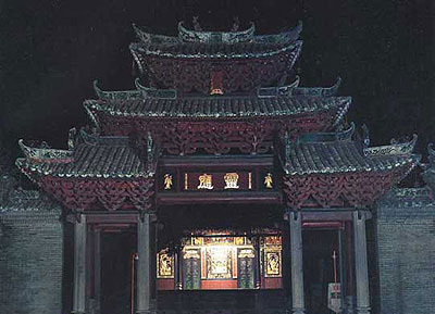 錦香正北的三門建于明景泰初年(1450),是進(jìn)入祖廟殿堂的正門(圖五)。建筑考究,檐下自東向西裝飾著金漆木雕花柱(圖六),雕刻內(nèi)容均為民間流傳的故事。屋頂有陶塑人物瓦脊橫貫全頂,陶塑高約1。5米,全廠31。6米,由152個(gè)人物組成,有"文如璧"字款。這種多姿多彩、生動(dòng)有趣的陶塑人物瓦脊,使建筑物更顯得高大壯觀,富麗堂皇。