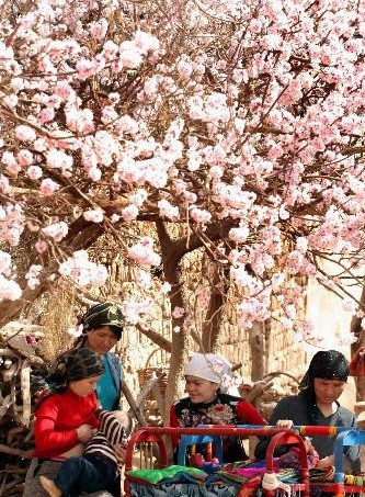 新疆吐魯番火焰山南麓達浪坎鄉僑亞村的婦女在繁花滿枝的杏樹下照料孩子。 近日,新疆吐魯番火焰山南麓達浪坎鄉的杏花盛開,人們紛紛來到戶外,欣賞春日美景。
