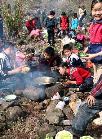 重慶市云陽縣江口小學的部分學生和教師在校園外野炊,度過了一個愉快的周末.