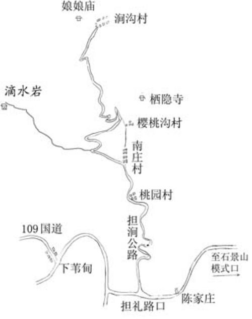 古書(shū)記載:“滴水巖在萬(wàn)山中”,“過(guò)仰山村折而西上黃牛崗口,益險(xiǎn)隘。”([清]《宸垣識(shí)畧》)幾乎所有滴水巖的古代記述都提到這個(gè)“黃牛崗口”,它似乎是去滴水巖的必經(jīng)之路。但當(dāng)我們問(wèn)及南莊和櫻桃溝村(即過(guò)去的仰山村)的村民,不論老少,卻無(wú)人知曉。但他們都能說(shuō)出去滴水巖的走法:從南莊的大西溝進(jìn)入,一直走到溝頂就是,約8里地。我們據(jù)此推斷,滴水巖即在溝頂,由此判斷再看溝口,怎么看怎么就是黃牛崗口,其一側(cè)的山麓緩緩上升,遠(yuǎn)看如臥牛一般。