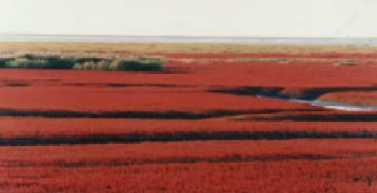 織就紅海灘的是一棵棵纖弱的堿蓬草——即一種適宜在鹽堿土質(zhì)——也是惟一一種可以在鹽堿土質(zhì)上存活的草。她每年4月長出地面,初為嫩紅,漸次轉(zhuǎn)深,10月由紅變紫。她不要人撒種,無需人耕耘,一簇簇,一蓬蓬,在鹽堿鹵漬里,年復(fù)一年地生生死死,死死生生。于光陰荏苒中,釀造出一片片火紅的生命邑澤。