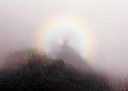 午后,攝身巖下,巖半布滿白??的云層,云層中驟然幻化出一個紅、橙、黃、綠、青、藍(lán)、紫的七色光環(huán),約一二米大小,中央虛明如鏡。金歡聲雷動。觀者背向偏西的陽光,有時會突然發(fā)現(xiàn)光環(huán)中出現(xiàn)自己的身影,猶如面對明鏡,舉手投腳,影皆隨形;奇者,即使成千上百人同時同地觀看,觀者也只能自見己影,不見。清人丁文燦在《看見佛光》一詩中云“云成五色現(xiàn)廳光,形似尼珠不可方。更有一樁奇事,人人影在?中藏。”這種佛光名“攝身光”。范成大在《光》詩中歌曰:
